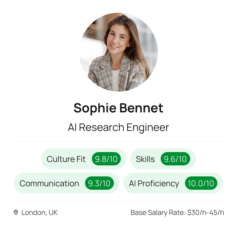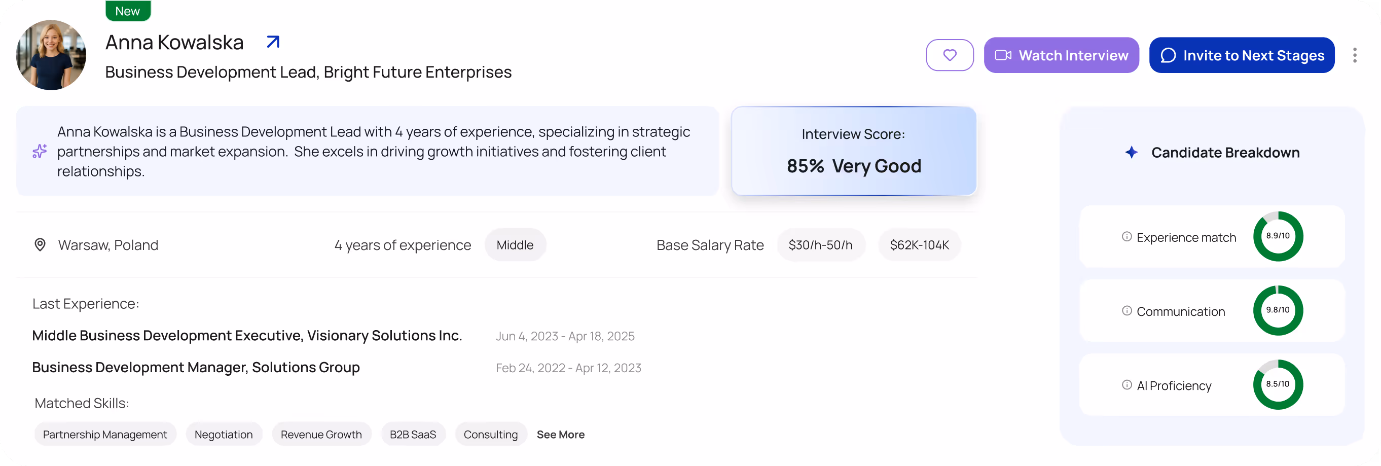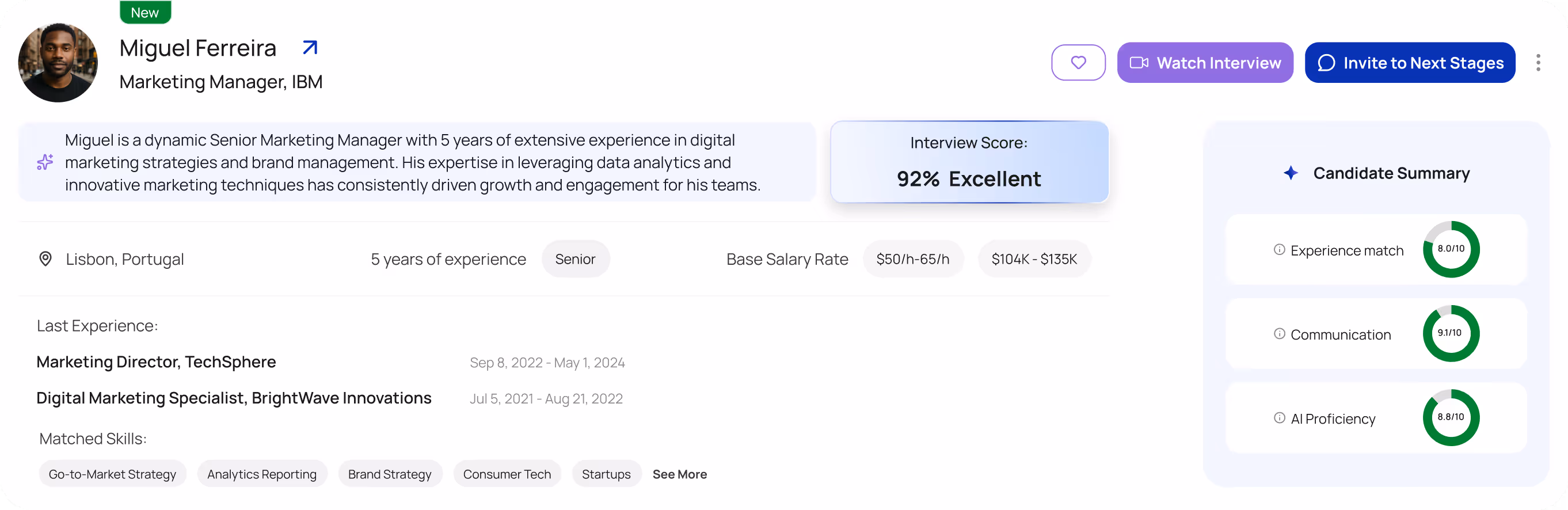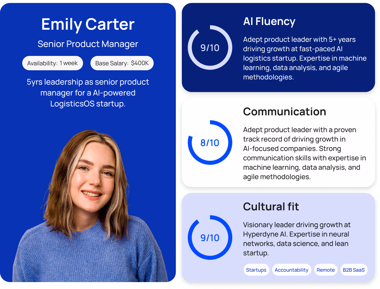 In-depth scoring on AI fluency, communication, culture fit & skills.