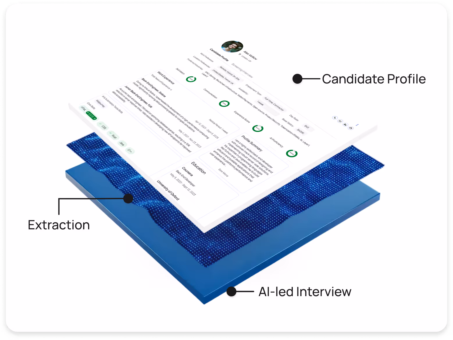 Every candidate takes a 10-20mins interview with our AI recruiter Alex, transformed into 1,000s of data points and creating profiles that are multiple levels deeper than Linkedin Recuiter.