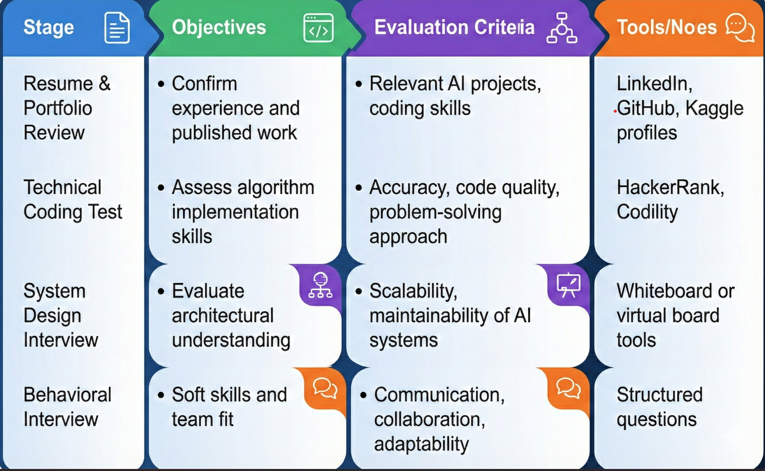 - System Design Interview: Assess candidate’s ability to architect scalable AI pipelines and integration with existing software systems.