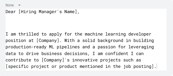Many ML engineer candidates overlook the cover letter or treat it as an afterthought. When you apply for machine learning developer roles, a concise and personalized cover letter can differentiate you.